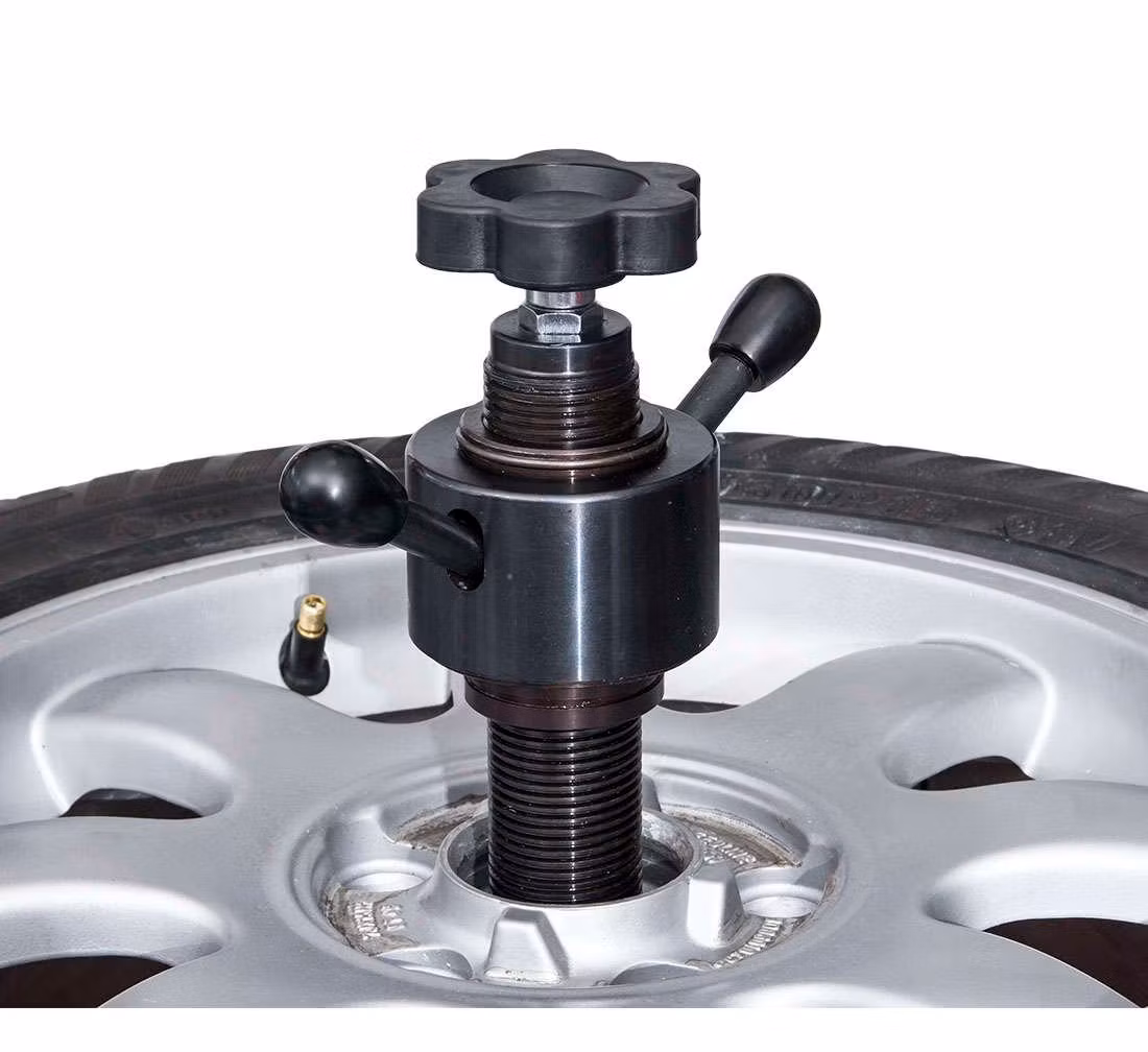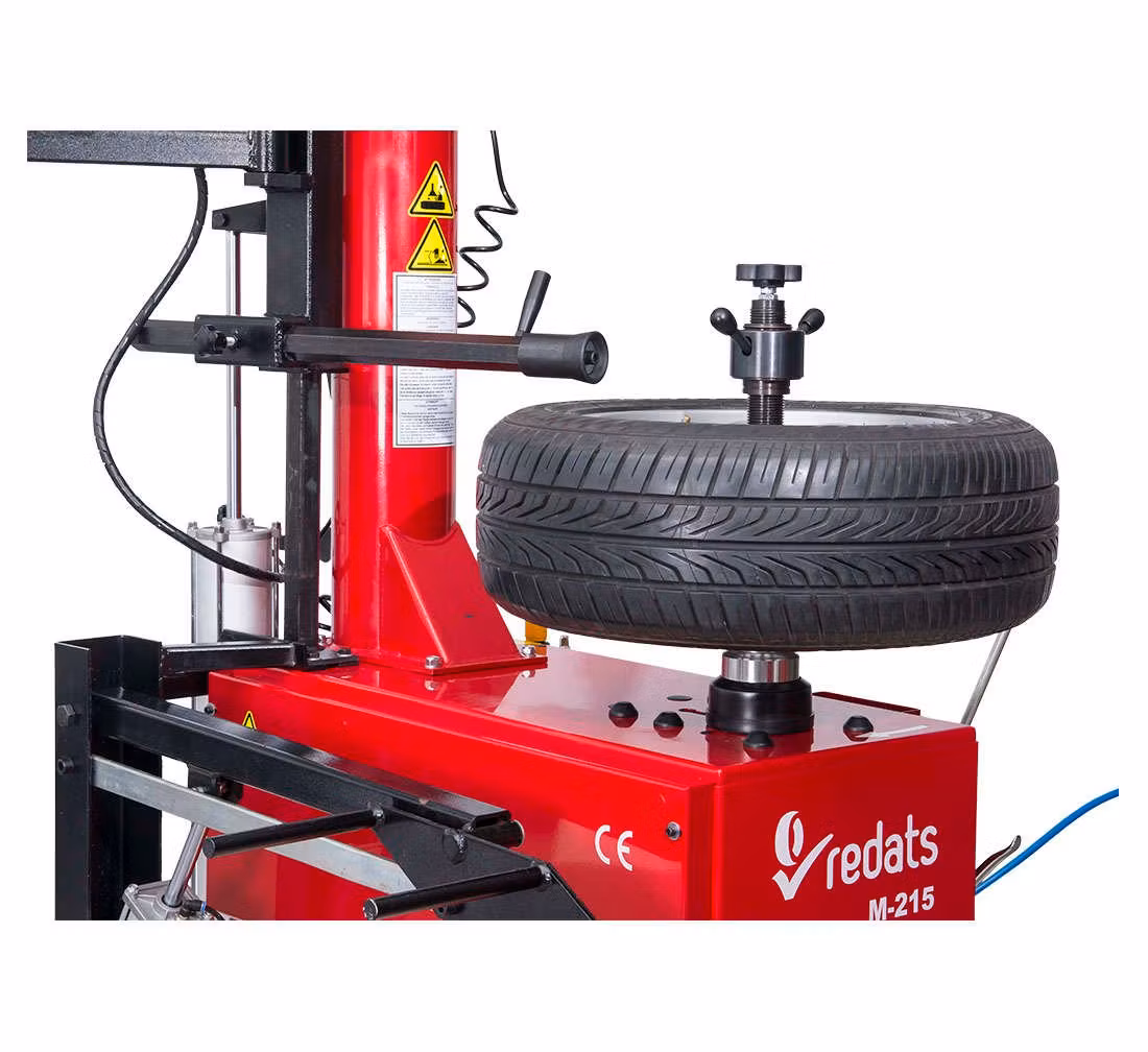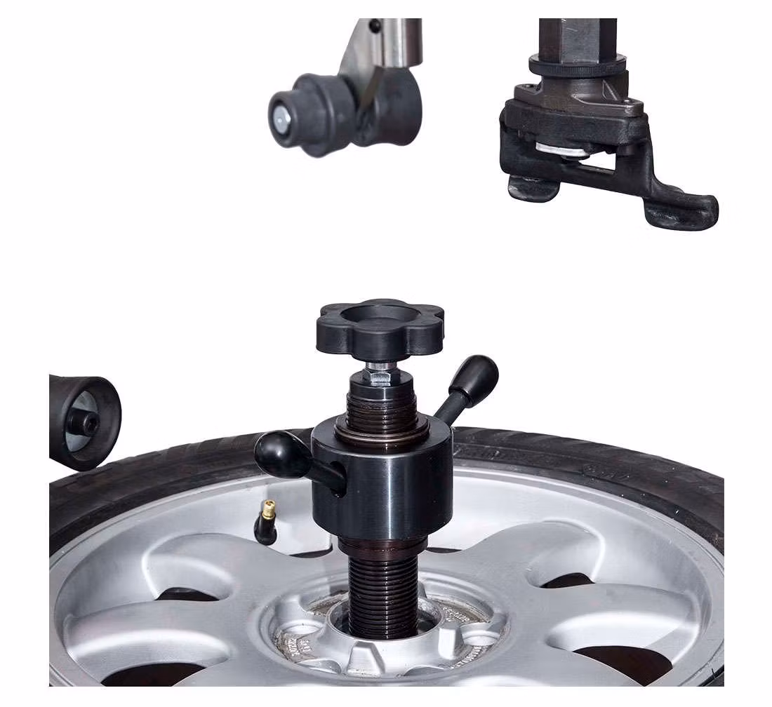 Som standard har denna däckmaskin ingen vändskiva. Hjulet monteras på en roterande axel med en justerbar gänga.