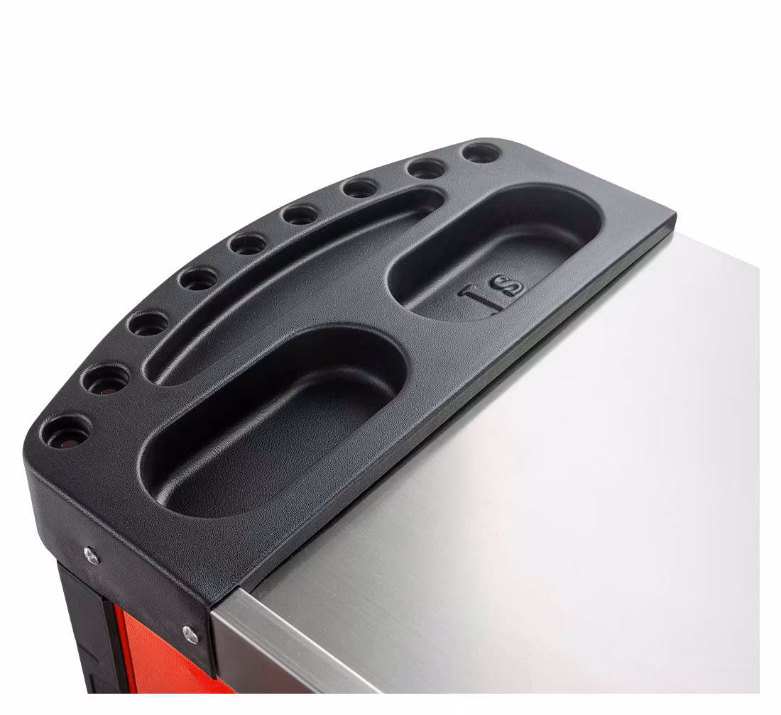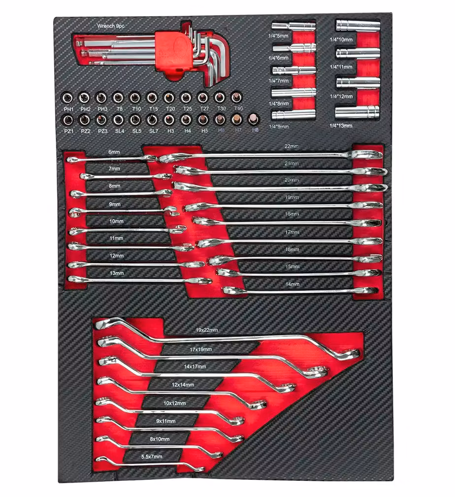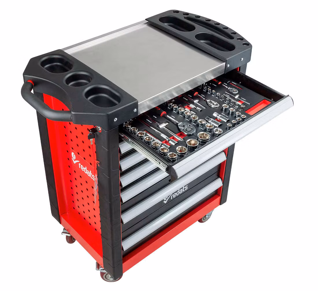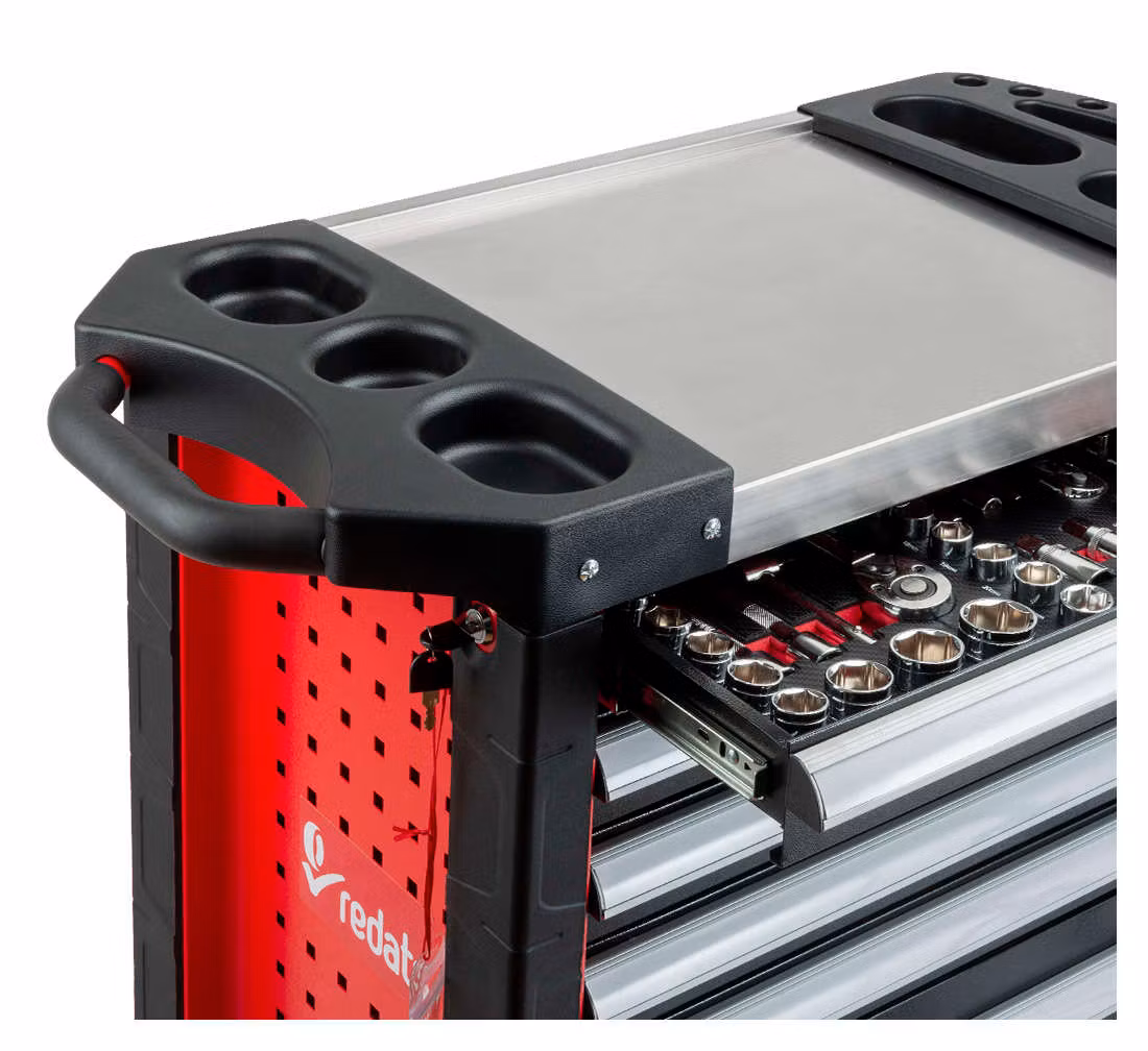 Sju utdragbara lådor med högkvalitativa verktyg och tillbehör organiserade i flera grupper: hylsnycklar med spärrnycklar, kombinationsnycklar skruvmejslar tång och insexnyckelskärare, tänger, hammare. 2 nedre lådor är för överdimensionerade verktyg (att fylla av dig)