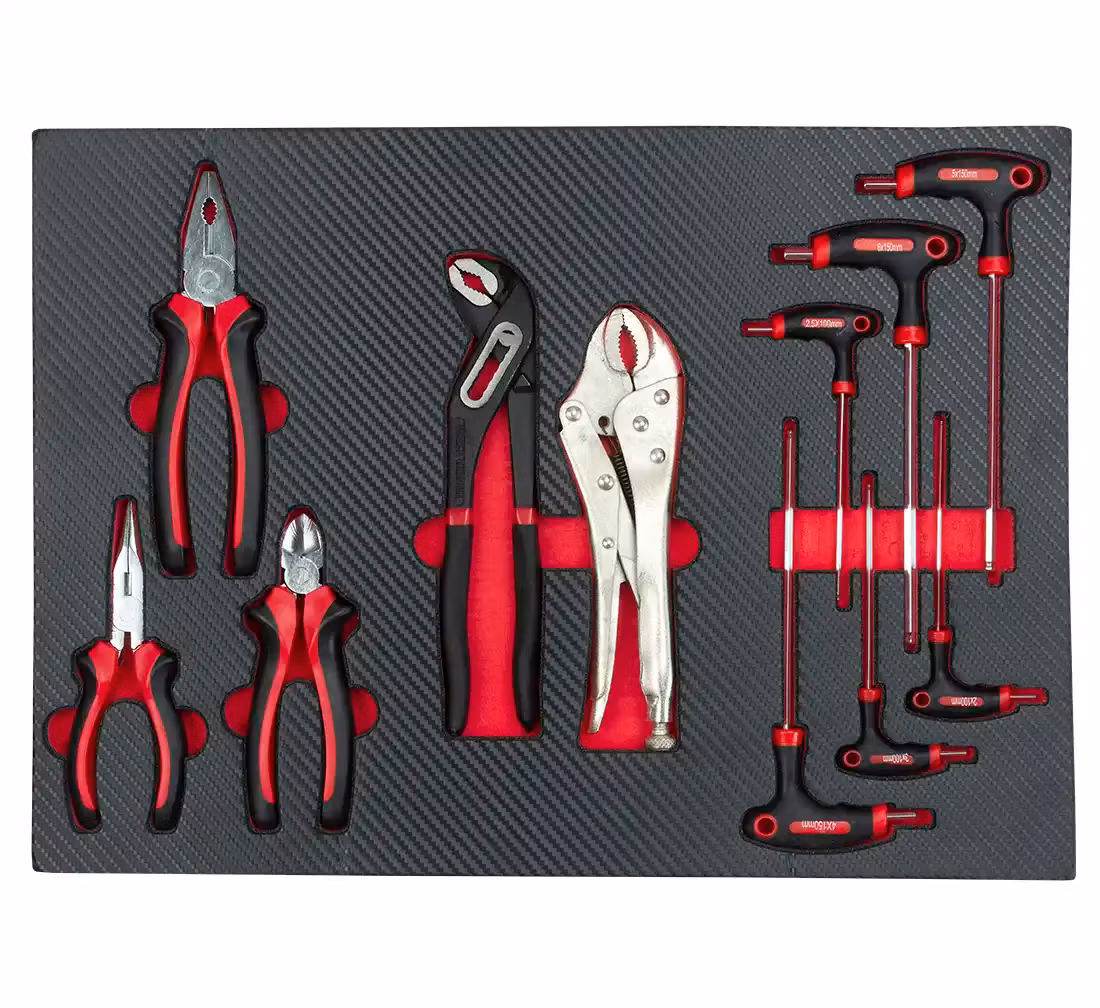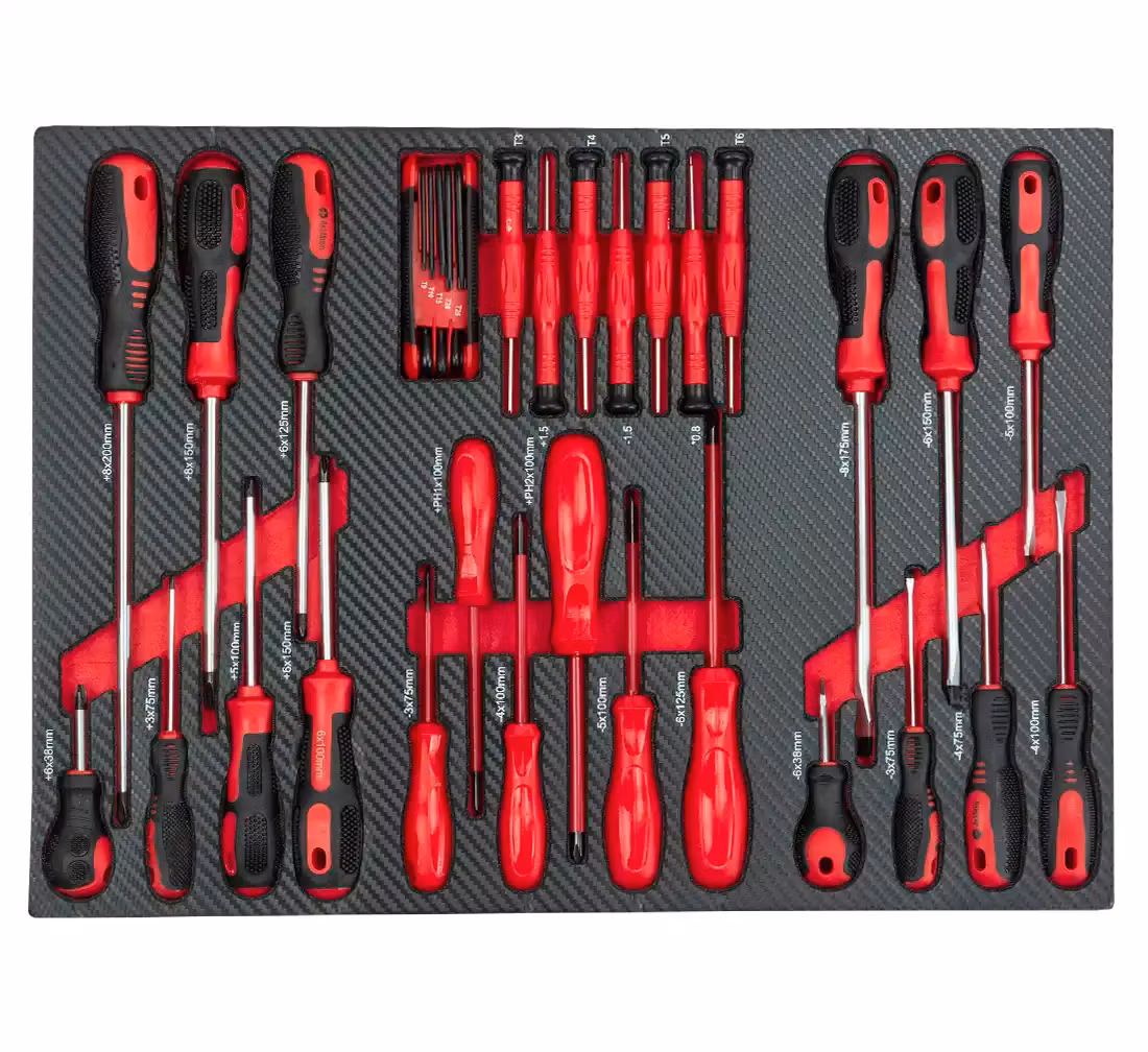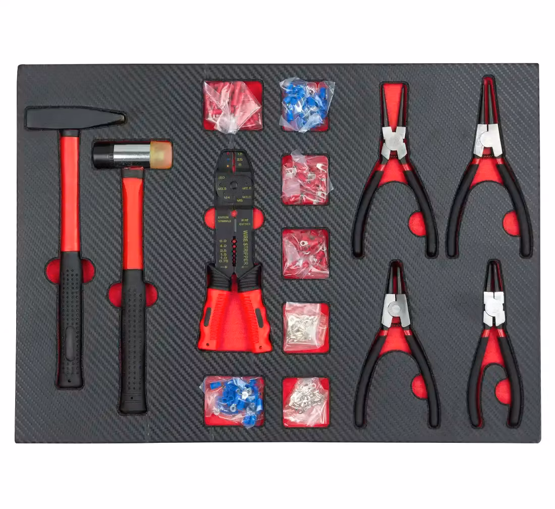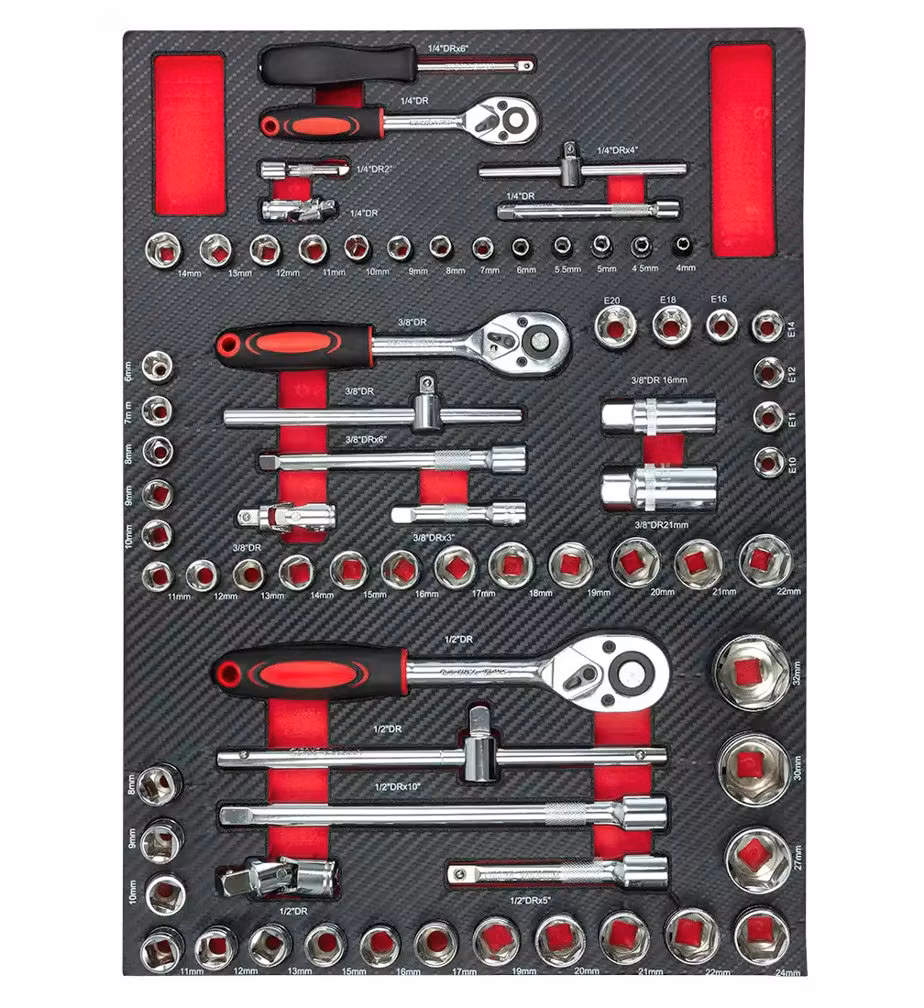 Sju utdragbara lådor med högkvalitativa verktyg och tillbehör organiserade i flera grupper: hylsnycklar med spärrnycklar, kombinationsnycklar skruvmejslar tång och insexnyckelskärare, tänger, hammare. 2 nedre lådor är för överdimensionerade verktyg (att fylla av dig)