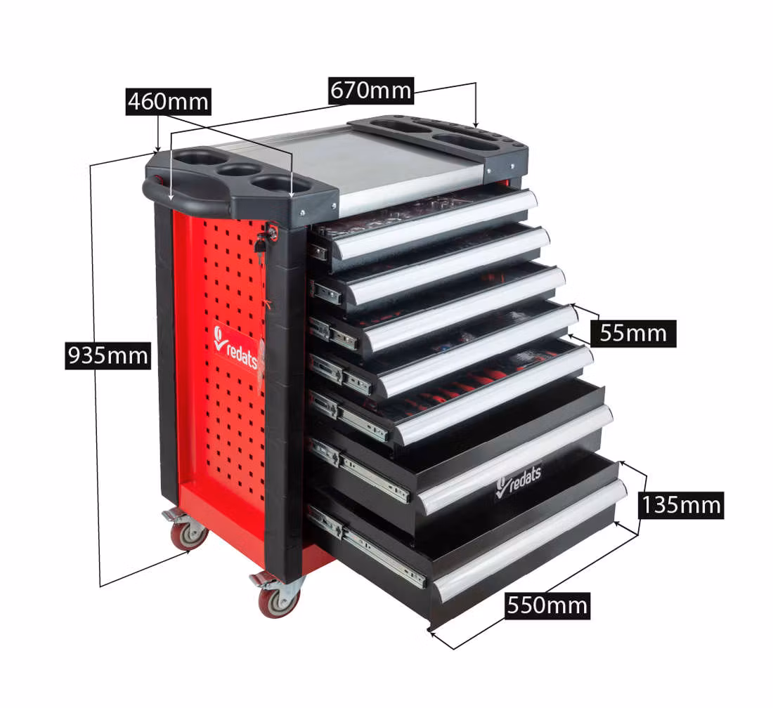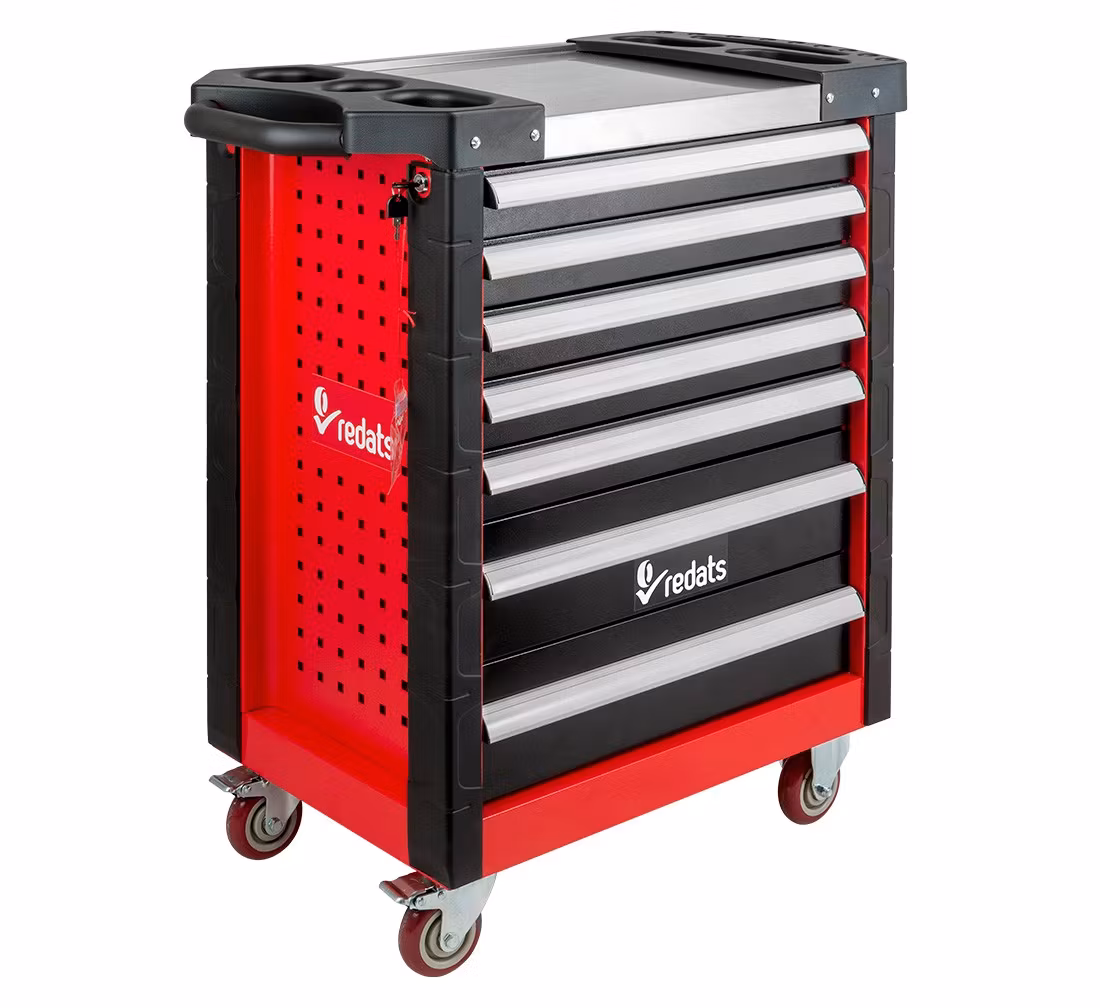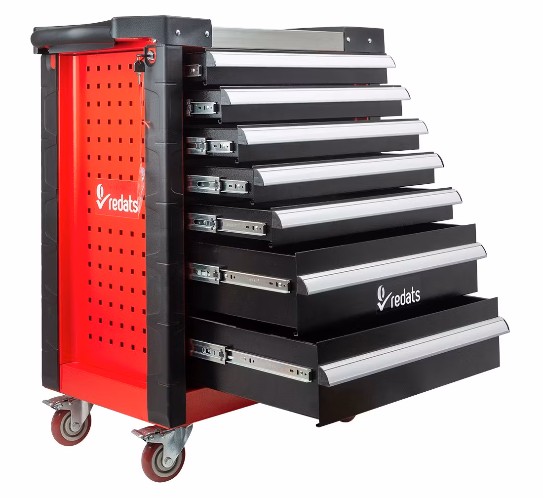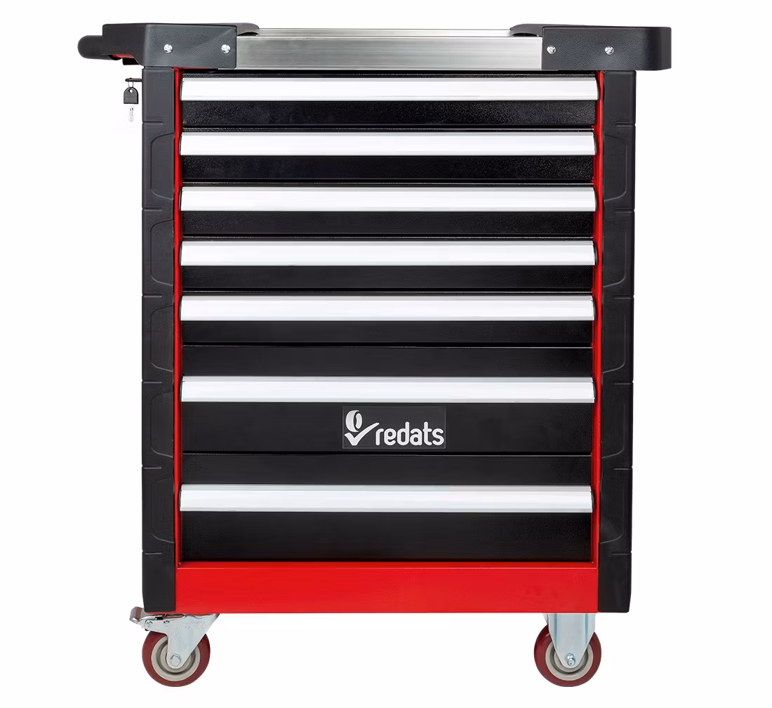 Verktygsskåp av hög kvalitet. Den perfekta produkten för din verkstad! En rejäl verkstadsvagn med sju lådor och utrustning med de mest använda professionella verkstadsverktygen. Lådorna har styrningar med kullager, centrallås och individuella lådlås. Vagnens rörlighet säkerställs av fyra stora, tåliga hjul, varav ett med broms. Skåpet kännetecknas av en mycket hållbar dubbelplåtskonstruktion, som garanterar tillförlitlig användning under svåra verkstadsförhållanden. För full funktionalitet har den även skyddande hörn av perforerat gummi och topp med fack.